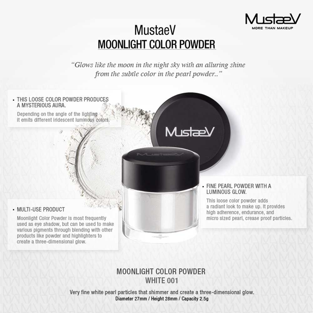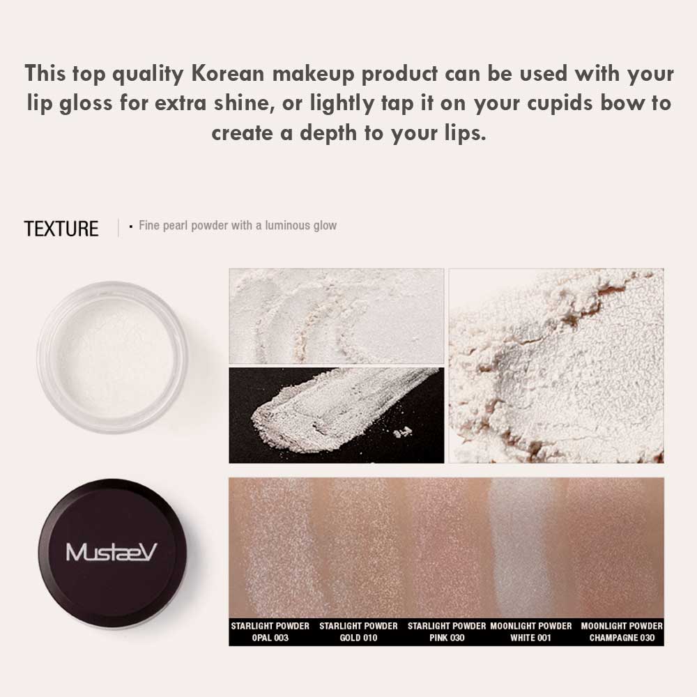 Features: A loose color powder made with fine white pearl particles that add a luminous look to make up. It provides high adherence, endurance, and micro-sized crease-proof pearl particles. Can be used alone or mixed with various products to create a three-dimensional glow. A multi-purpose Korean cosmetic product created by MustaeV provides high shine to your eyelids, as well as a highlighter for high cheekbones. This top-quality Korean makeup product can be used with your lip gloss for extra shine, or lightly tap it on your cupids bow to create a depth to your lips. The loose powder adds a radiant look, and the micro textured pearls provide a long-lasting wear. Technical Details
